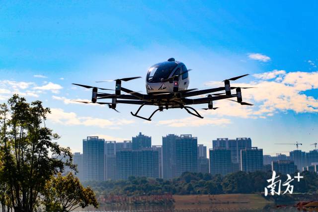 亿航无人驾驶载人航空器在中新广州知识城九龙湖上空飞行。