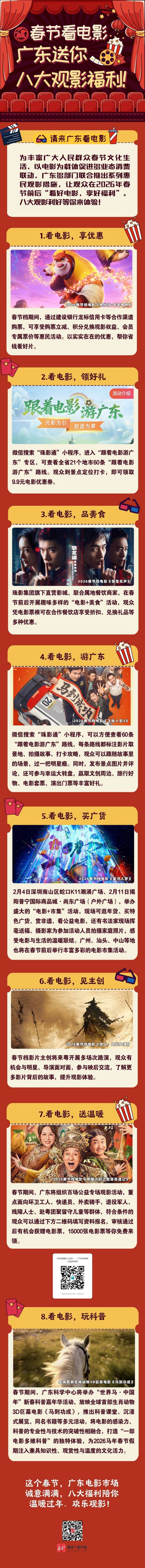 2026年春节脚步将近,近日,广东多部门联合推出系列惠民观影措施,以电影为载体促进多业态消费联动,进一步丰富广大人民群众春节文化生活,让观众在2026年春节前后“看好电影、享好福利”。