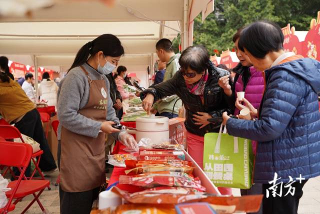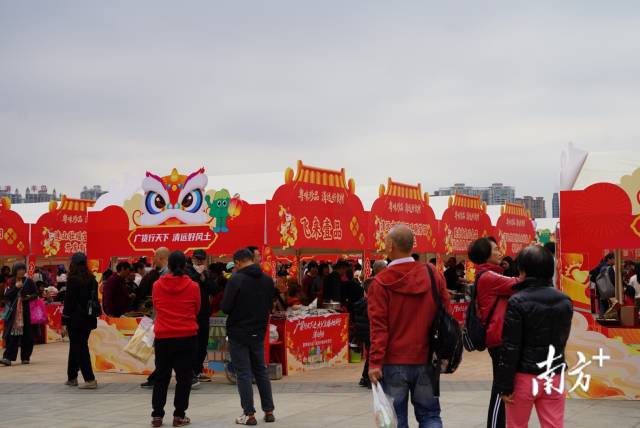 凤城广场内张灯结彩,年味十足,活动现场俨然成为一场集“品、购、玩”于一体的清远风味嘉年华,人头攒动、热闹非凡,处处洋溢着新春的喜庆与消费的火热。线下展销区里,清远鸡、英德红茶、西牛麻竹笋、清远丝苗米等清远“五大百亿”农业龙头产品悉数亮相,新春好物琳琅满目,每个摊位前都围满了前来咨询、试吃、选购的市民。大家手持购物袋,挑选着心仪的年货,试吃清远鸡的市民对其鲜嫩口感连连称赞,英德红茶区更是座无虚席,沉浸式的体验让市民在家门口就能一站式置办地道粤味年货。