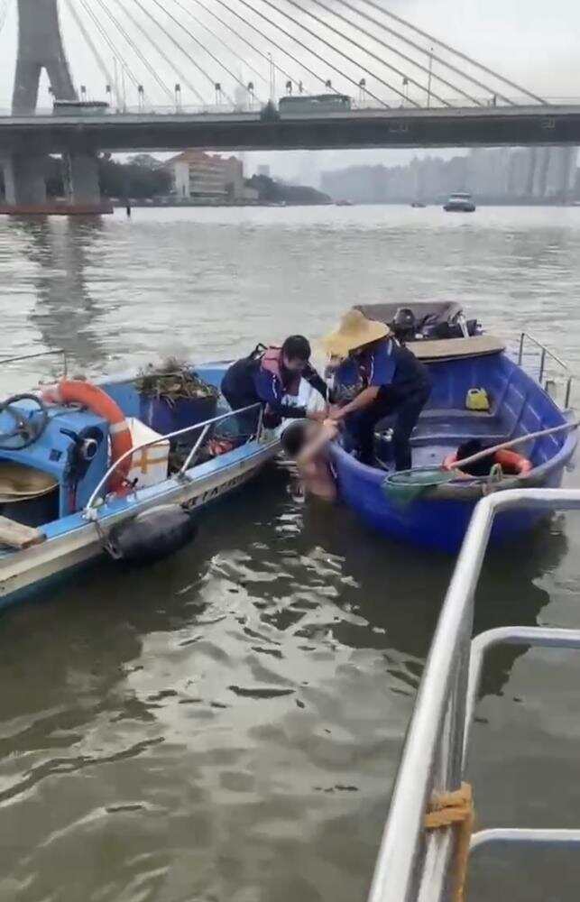 “听到对讲机里刘春生呼救,我马上开船过去。”“广州环投101”作业船驾驶员唐小建表示,听到对讲机里的呼救并驶向现场后,看到落水者已经抓住刘春生抛出的救生圈,并被拖到刘春生的船前。唐小建驾船小心向“广州环投001”“广州环投004”两船靠近。三艘船在珠江江面向落水者围出一个三角形的空间。在确保安全后,刘春生、雷诗迪合力将落水者拉起。