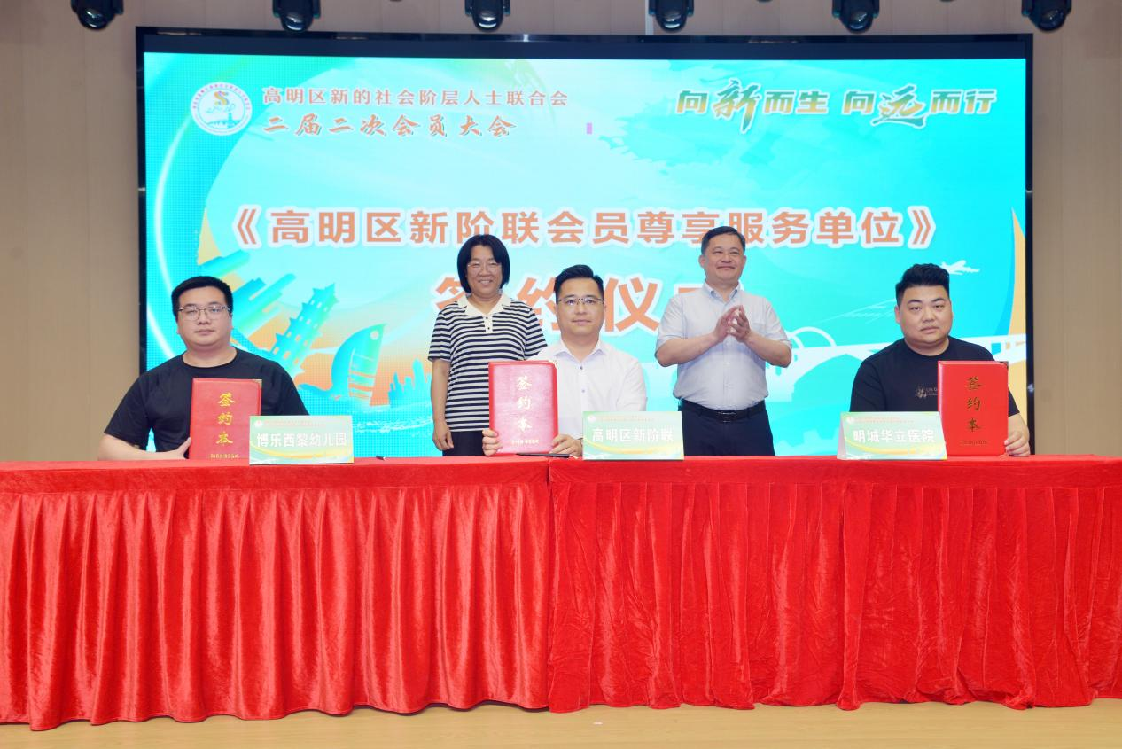 为了更好地推动会务发展,高明区新阶联与博乐西黎幼儿园、明城华立医院签订“尊享服务单位”协议,为会员提供医疗、教育等专属权益。