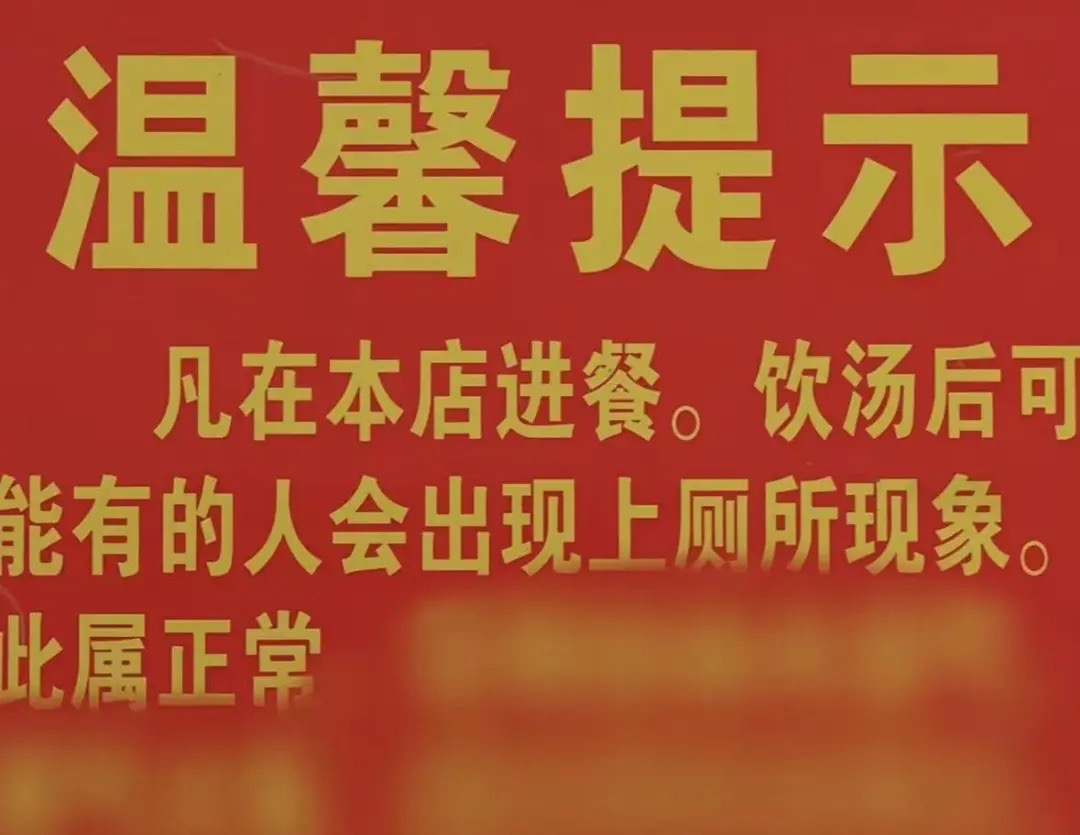 紧接着,店墙上的那张“温馨提示”也被扒了出来:“凡在本店进餐,饮汤后可能有的人会出现上厕所现象,此属正常……建议再饮多两次,将你体内的毒素、湿气、寒气排净。”野生药材、季节调理、孕妇除外——这些关键词叠加在一起,让一家原本普通的农家鸡煲店,蒙上了一层“药膳养生”的神秘色彩。