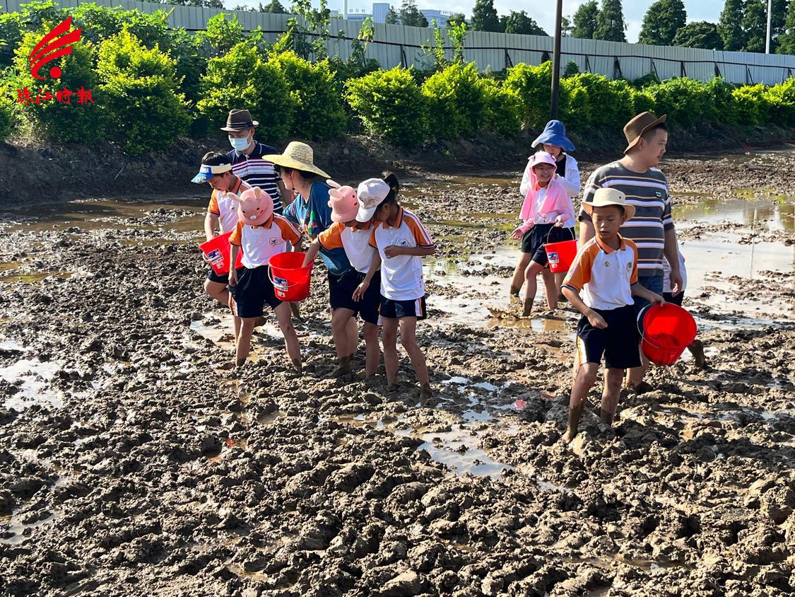 除了体验插秧,现场还能体验种植马蹄。同学们赤着小脚丫行走在泥土里,拿起马蹄种子,挥洒在田间,同时也把自己心中的梦想播种在心间。