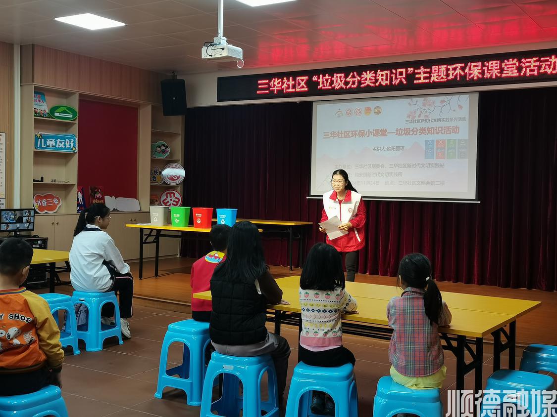 11月24日,“垃圾分类知识”主题环保课堂在均安镇三华社区文明会馆开讲。