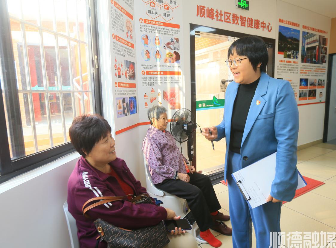 顺峰社区党委书记谢慧仪与居民在社区数智健康中心聊天。