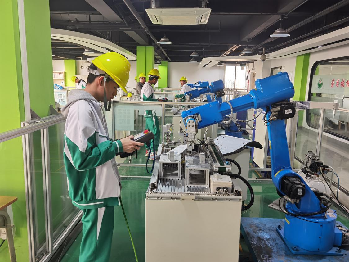 华材职校的学生们正在操控机器人搬运码垛。/学校供图