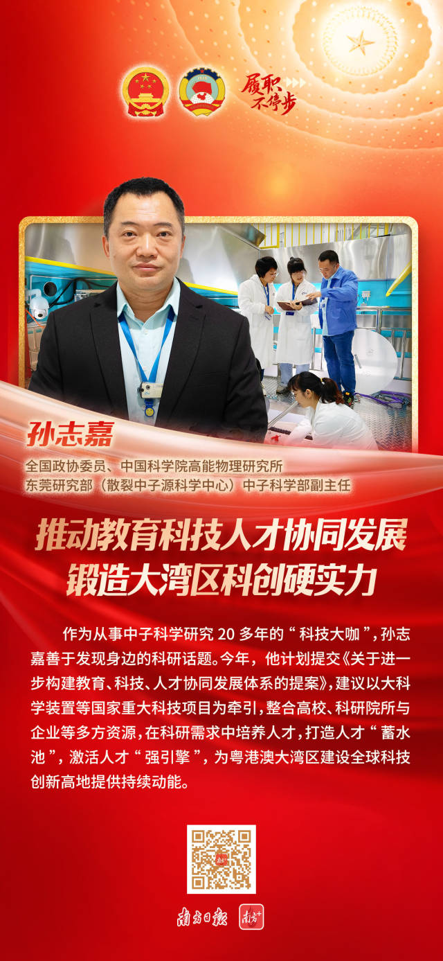 全国两会召开前夕,孙志嘉多次实地调研、频繁座谈交流,反复推敲打磨提案。今年,他计划提交《关于进一步构建教育、科技、人才协同发展体系的提案》,建议以大科学装置等国家重大科技项目为牵引,整合高校、科研院所与企业等多方资源,在科研需求中培养人才,打造人才“蓄水池”,激活人才“强引擎”,为粤港澳大湾区建设全球科技创新高地提供持续动能。