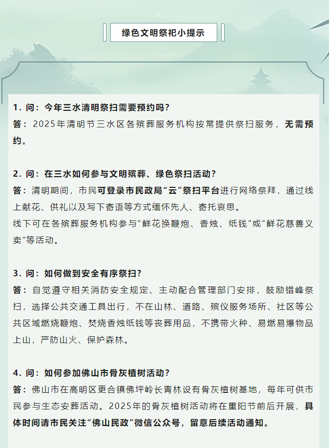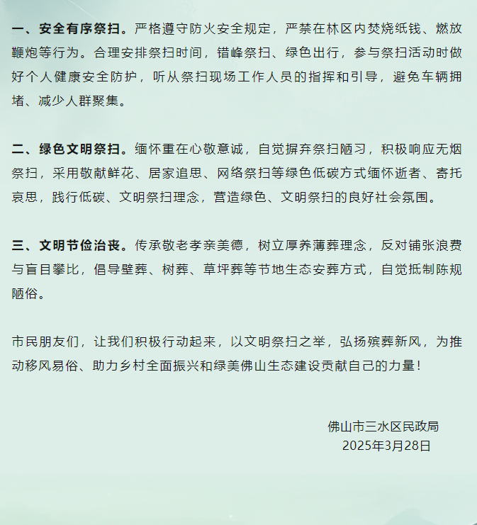 三水区殡仪馆工作人员彭建斌表示,清明不仅是人们缅怀先人的重要节日,更是传承传统殡葬文化、推动殡葬改革的关键契机。“希望通过集体公祭活动,更好地倡导文明祭扫、绿色祭扫、生态祭扫的祭祀新风尚,让清明更‘清明’,让‘身后事’成为百姓的放心事”。