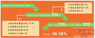 昨日,禅城区召开2015年政协提案交办会。据悉,禅城区政协三届五次会议期间,共收到政协委员有效提案234件,经审查,确定立案226件(合并后提案共202件),立案率达96.58%。