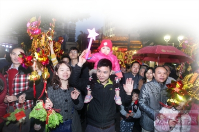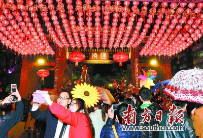 5日元宵佳节佛山迎来了一年一度的行通济活动,虽然天空下起了毛毛细雨,但并没有消减市民的热情,从下午6点钟开始,通济桥附近的人流量就在陆续增加。