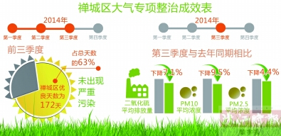 今年前三季度,禅城区优良天数为172天,占总天数63%,未出现严重污染。第三季度,三项重要指标均呈下降趋势——与去年同期相比PM10平均浓度下降9.5、PM2.5平均浓度下降4.4%,数据表明禅城区大气专项整治取得了一定的成效。